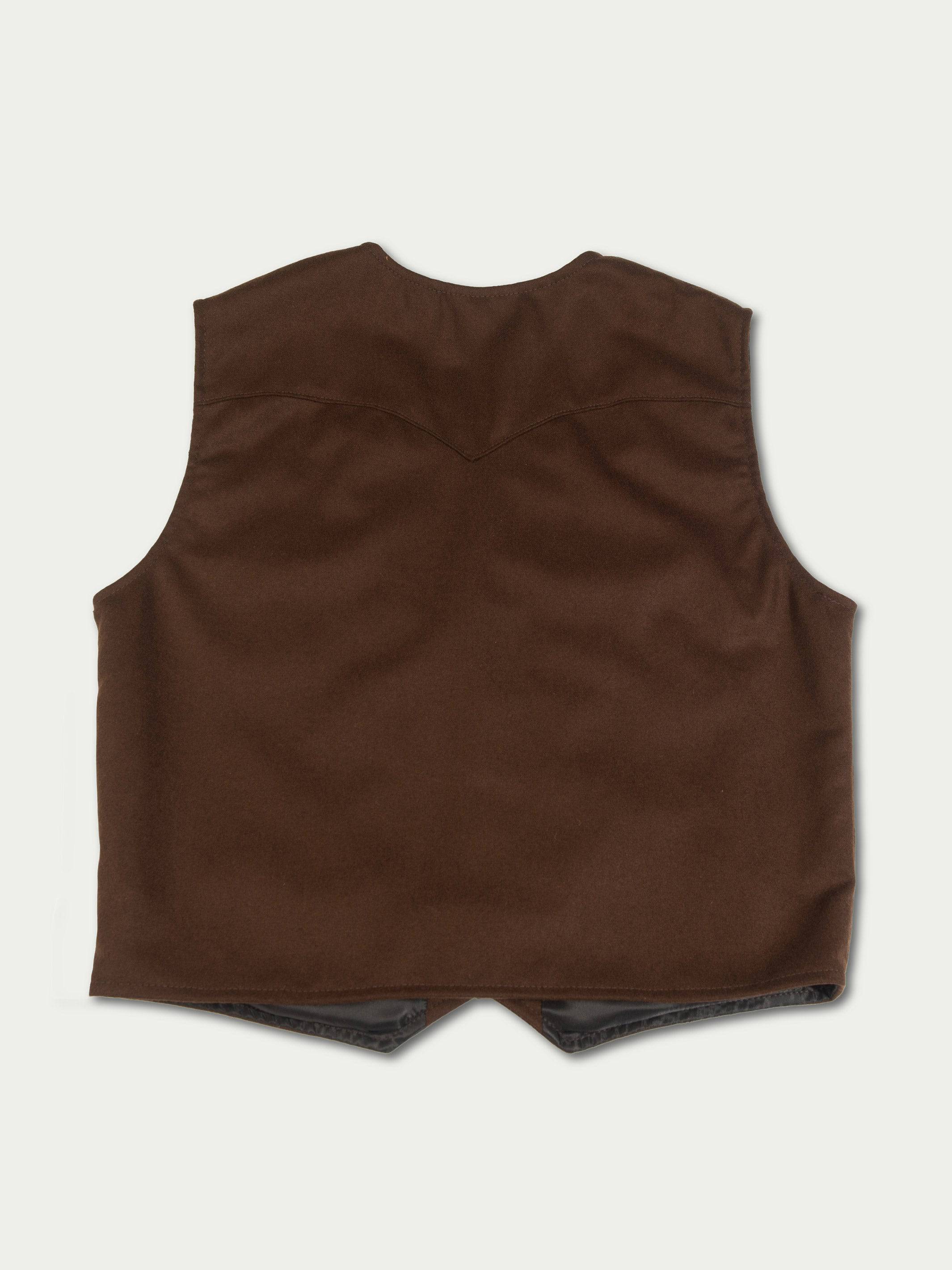 Wear it proudly. Schaefer's NEW Texas Ranger McAllin Vest celebrates the Texas Rangers who have stood vigilant protecting the citizens of Texas since 1823. Crafted from 15 oz. Legacy Melton Wool and lined with double-pocketed premium taffeta for a go-on silky smooth feel. This fine vest is detailed with a four pocket front with full-grain chocolate leather piping trim on the lower pocket welts. The McAllin is endorsed by the Texas Ranger Foundation. Schaefer Outfitter donates a portion of the sales price to the development of the new Texas Ranger Heritage Center in Fredericksburg, Texas. Join us to honor and preserve the history of the Texas Ranger for years to come. Offered exclusively in Chocolate with solid brass logo snaps featuring the Texas Star as the centerpiece.